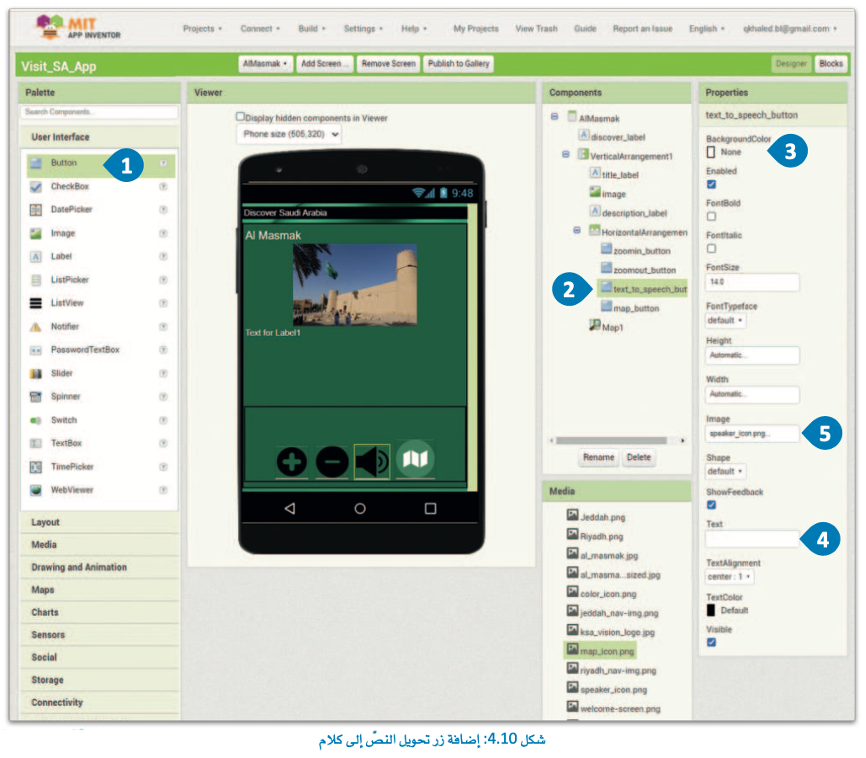 سنُضيف الآن زرًا يقوم بتنشيط مكون Text-To-Speech(تحويل النص إلى كلام) الذي يستخدم نظام صوت جهاز الهاتف المحمول لقراءة نص محدد بصوت عالٍ.
