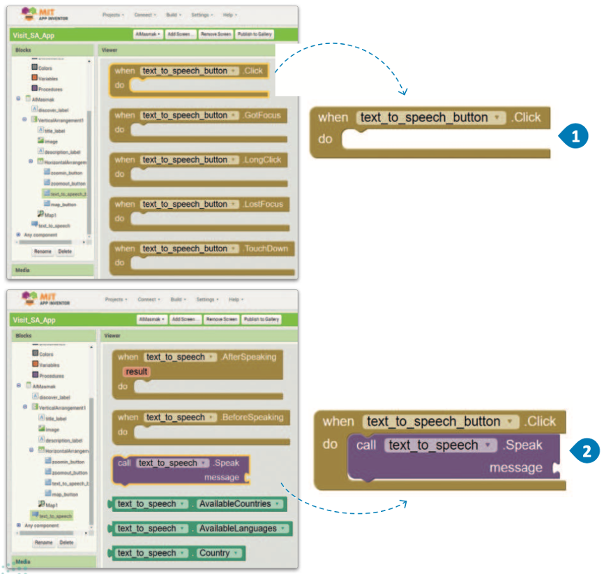 - حدِّد حدث Click (الضغط) لمُكوِّن text_to_speech_button (زرّ_تحويل النصّ_إلى_كلام).