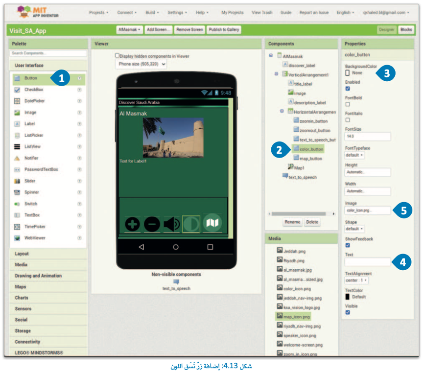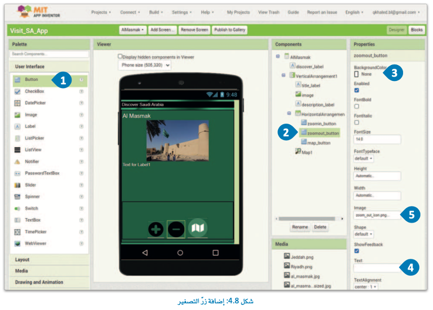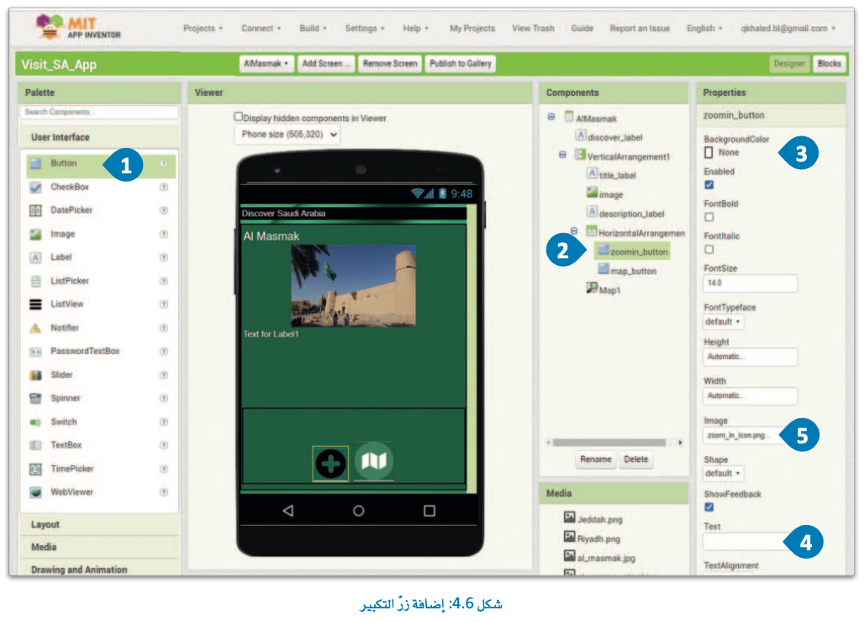 سنُضيف أولاً المكونات إلى قسم Designer (المصمم)، ثم نُبرمج وظائفها من قسم Blocks (اللبنات البرمجية).
