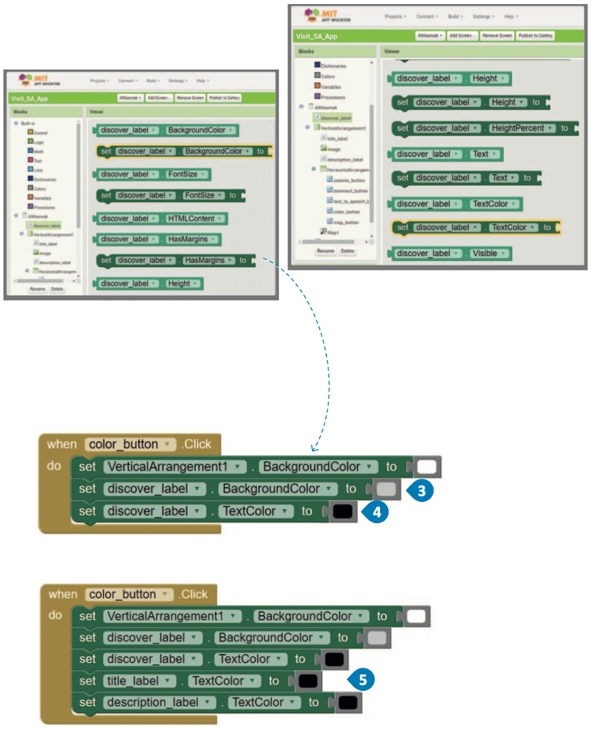 - حدِّد حدث Click (الضغط) لمُكوِّن color_button (زرّ_اللون).