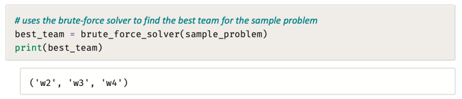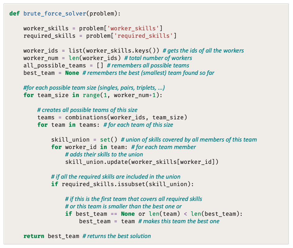 بعد ذلك، يمكِن إنشاء الدالة التالية لحل مشكلة تكوين الفريق بأسلوب القوة المُفرطة، وهذه الخوارزمية تأخذ بعين الاعتبار جميع أحجام الفِرق المُمكِنة، ويتم إنشاء الفِرق بناءً على الأعداد المُمكِنة، ثم تقوم بحصر الفِرق التي تستوفي كل المهارات المطلوبة وتحدِّد الفريق الأقل عددًا: