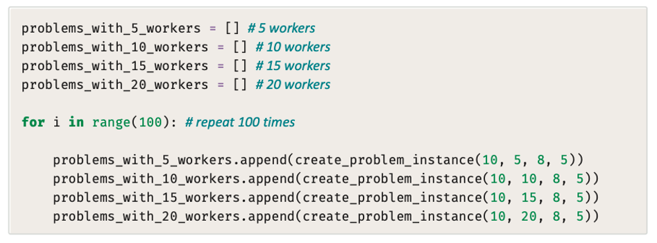 يمكِن توضيح ذلك من خلال إنشاء نُسخ لمشكلات متعدِّدة من حيث تزايد عدد العمَّال، ومن الممكن استخدام المقطع البرمجي التالي لتوليد نُسخ متنوعة من مشكلة تكوين الفريق، حيث يتنوع عدد العمَّال ليكون: 5 و10 و15 و20، ثم يتم توليد 100 نسخة بعدد العمَّال، وتشمل كل النُسخ المهارات الإجمالية العشر، والمهارات الثمان المطلوبة، والخمس مهارات كحدٍّ أقصى لكل عامل: