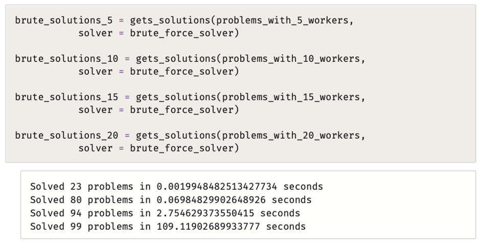 يَستخدِم المقطع البرمجي التالي هذه الدالة وخوارزمية الحل بالقوة المُفرطة لحساب الحلول المُمكِنة لمجموعات البيانات التي تم إنشاؤها سابقًا والمُكوَّنة من 5-workers (خمسة_عمَّال)، و10-workers (عشرة_عمَّال)، و15-workers (خمسة عشر_عاملًا)، و20-workers (عشرين_عاملًا):