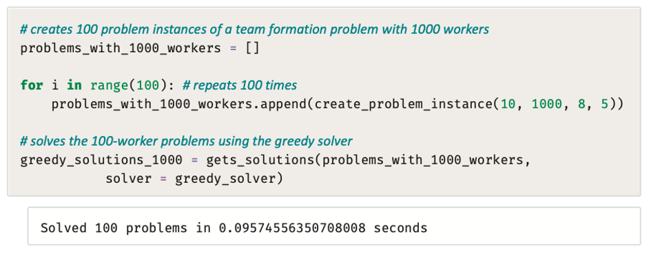 يَستخدِم المقطع البرمجي التالي خوارزمية الحل الجشعة لحساب حلول مجموعات البيانات: 5-workers (خمسة_عمَّال)، و10-workers (عشرة_عمَّال)، و15-workers (خمسة عشر_عاملًا)، و20-workers (عشرين_عاملًا) التي تم استخدامها سابقًا لتقييم خوارزمية الحل بالقوة المُفرطة: