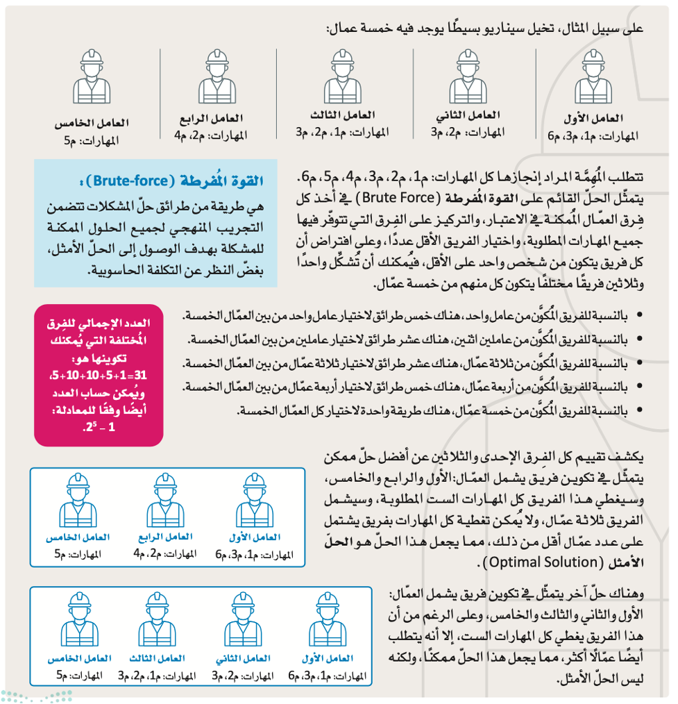 • إذا كان لديك 20 عمَّال، فسيكون عدد الفِرق المُمكِنة: 220 – 1 = 1,048,575.