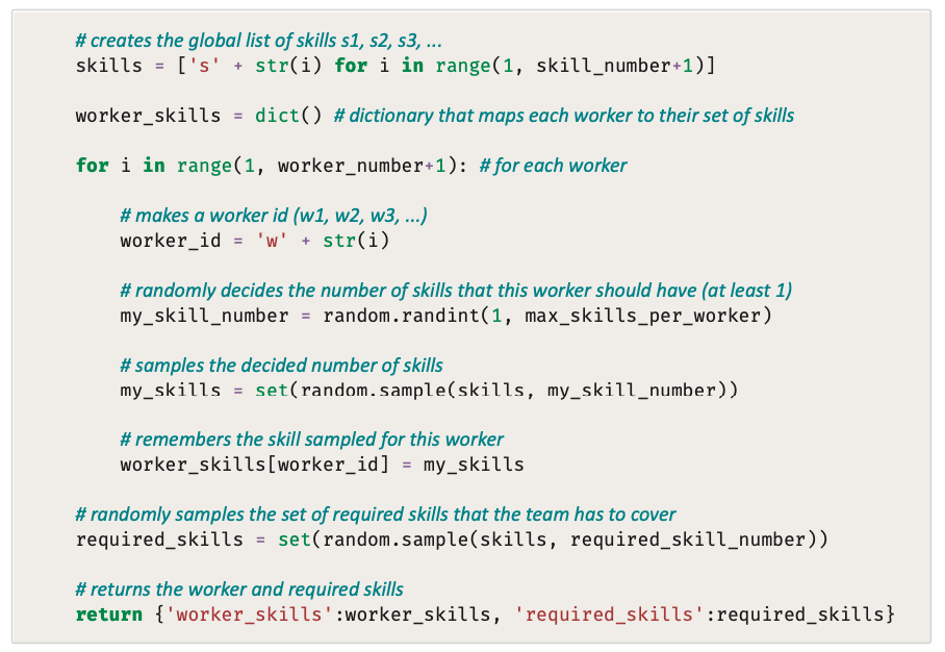 من الممكن استخدام الدالة التالية لإنشاء أمثلة عشوائية لمشكلة تشكيل الفرق، وتسمح هذه الدالة للمستخدِم أن يقوم بتحديد 4 معاملات هي: العدد الإجمالي للمهارات التي يجب أن تؤخذ بعين الاعتبار، والعدد الإجمالي للعمَّال المتوفِّرين، وعدد المهارات التي يجب أن تتوفَّر في أعضاء الفريق بشكل جماعي حتى ينجزوا المهمَّة، والعدد الأقصى للمهارات التي من الممكن أن يمتلكها كل عامل.