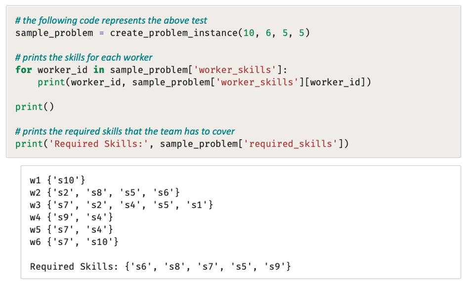 ستقوم الآن باختبار الدالة الواردة سابقًا من خلال إنشاء نسخة من مشكلة معطياتها كالتالي: 10 مهارات إجمالية، 6 عمَّال، وتتطلَّب 5 مهارات كحدٍّ أقصى لكل عامل.